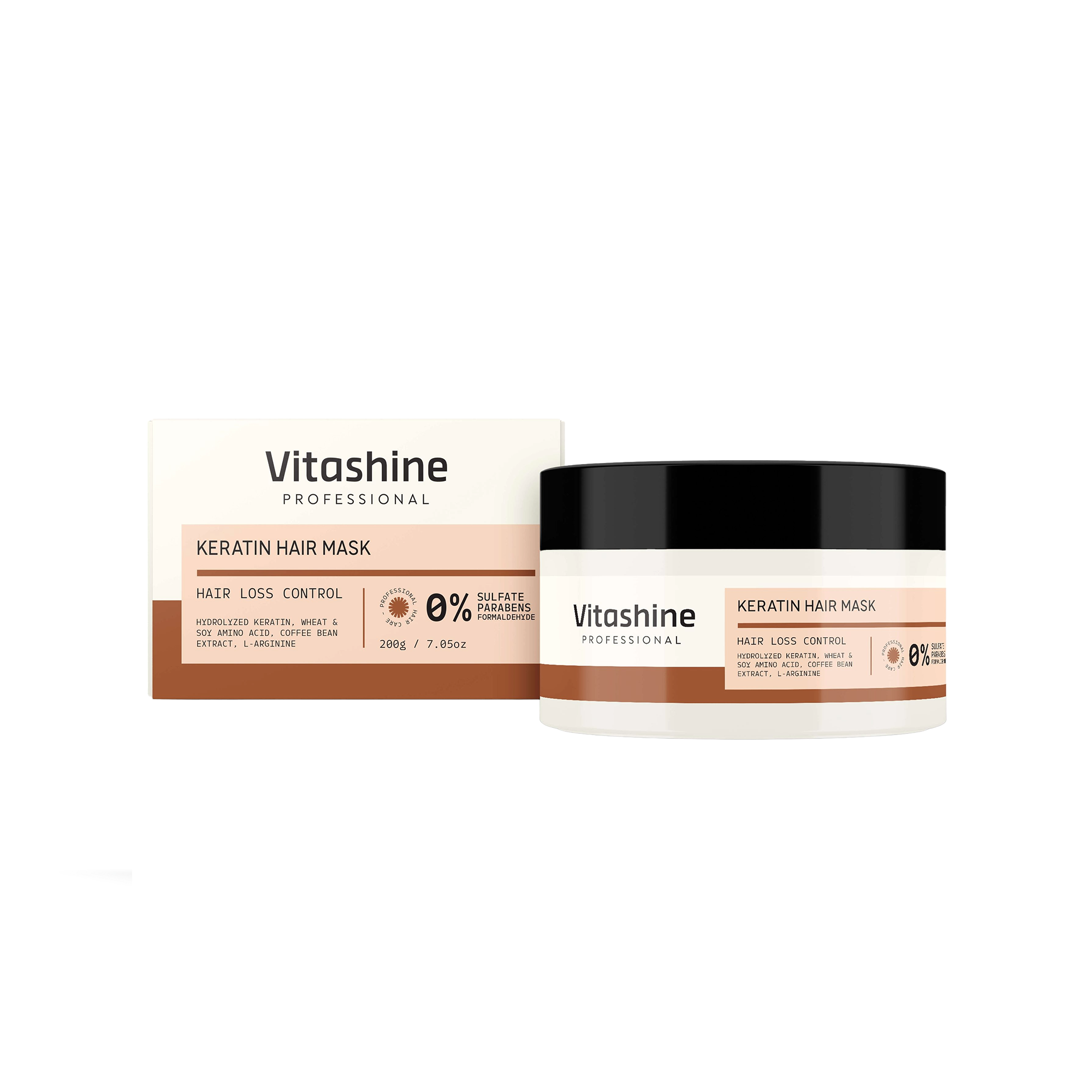 Vitashine Professional Keratin Hair Mask is a topical conditioning formulation developed to support hair fiber structure and surface integrity. The formulation combines hydrolyzed keratin, amino acids, peptides, botanical extracts, and cationic conditioners to address hair shaft stress associated with chemical or environmental exposure. It is intended for professional cosmeceutical use.